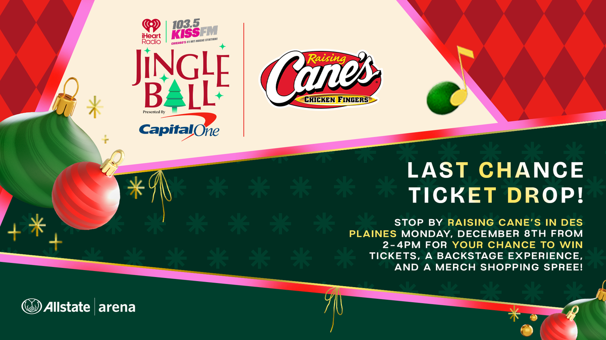 Stop by Raising Cane's in Des Plaines on MONDAY, December 8th 2025 for your LAST CHANCE to win tickets to the 103.5 KISS FM Jingle Ball presented by Capital One at the Allstate Arena featuring Teddy Swims, Nelly, Jessie Murph, Ravyn Lenae, Shinedown, Zara Larsson, Renee Rapp, Jackson Wang, Audrey Hobart and a special sing-a-long moment for KPOP DEMON HUNTERS!
