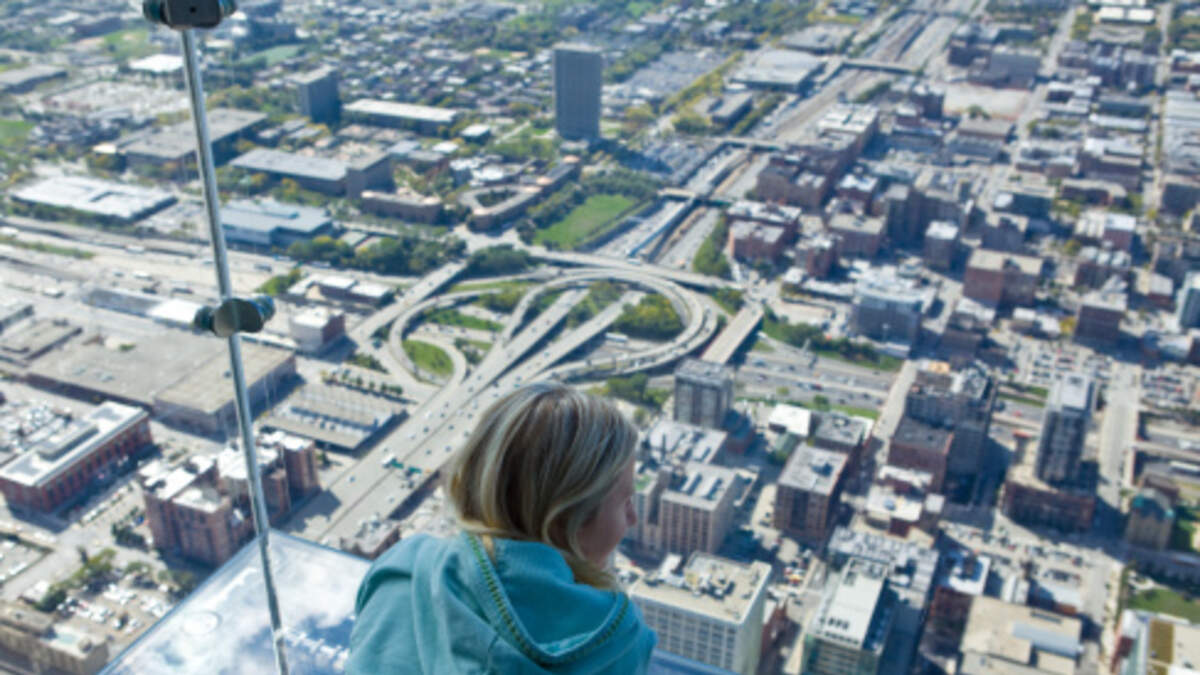 Tourist admiring view of Chicago from Sears Tower